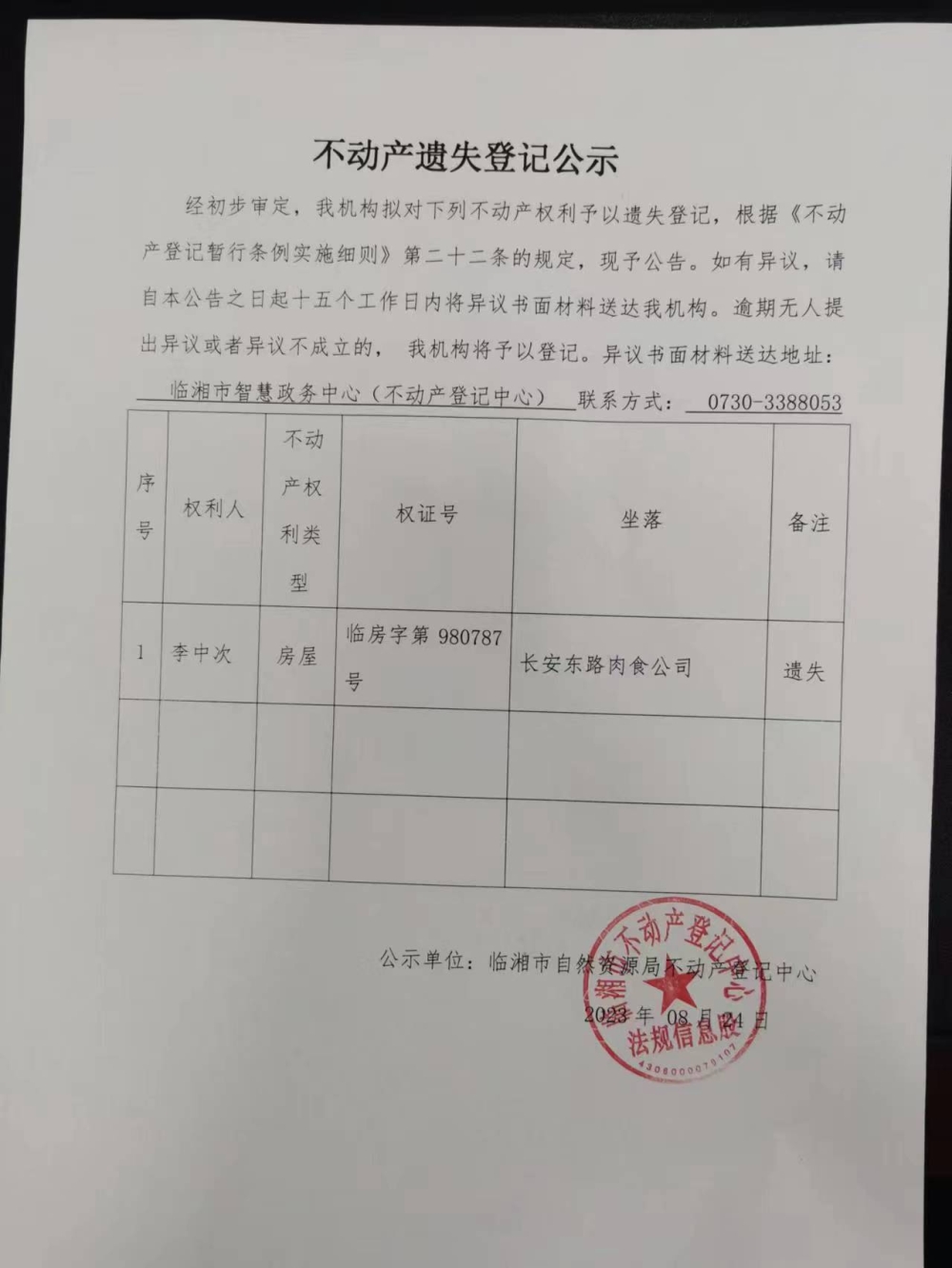 李中次不动产遗失登记公示