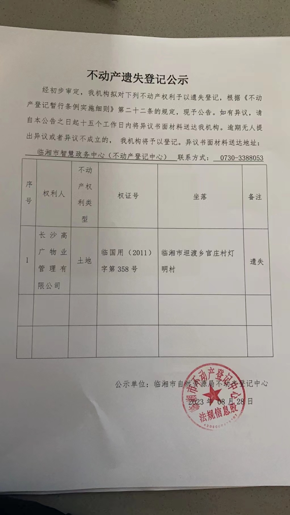 长沙高广物业管理有限公司不动产遗失登记公示