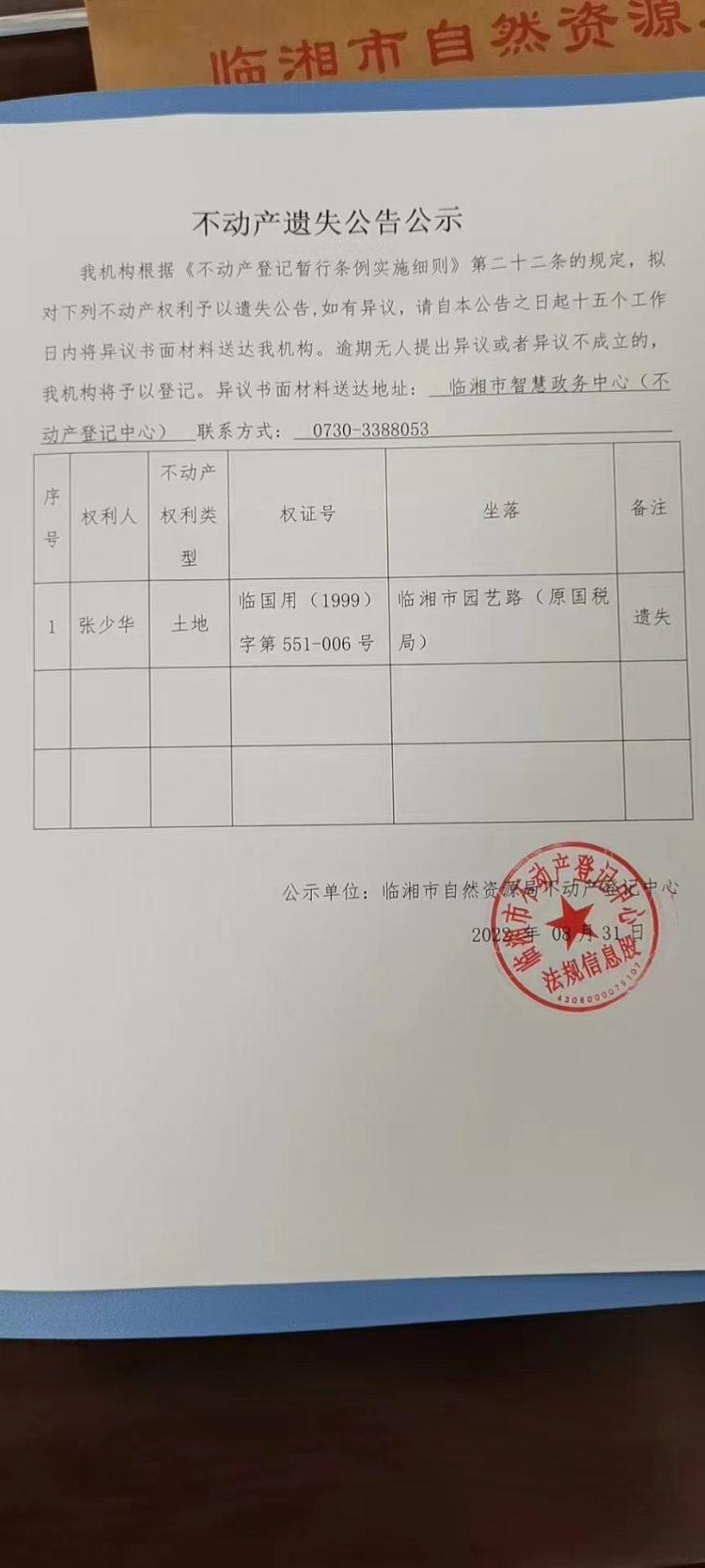 张少华不动产遗失公告公示