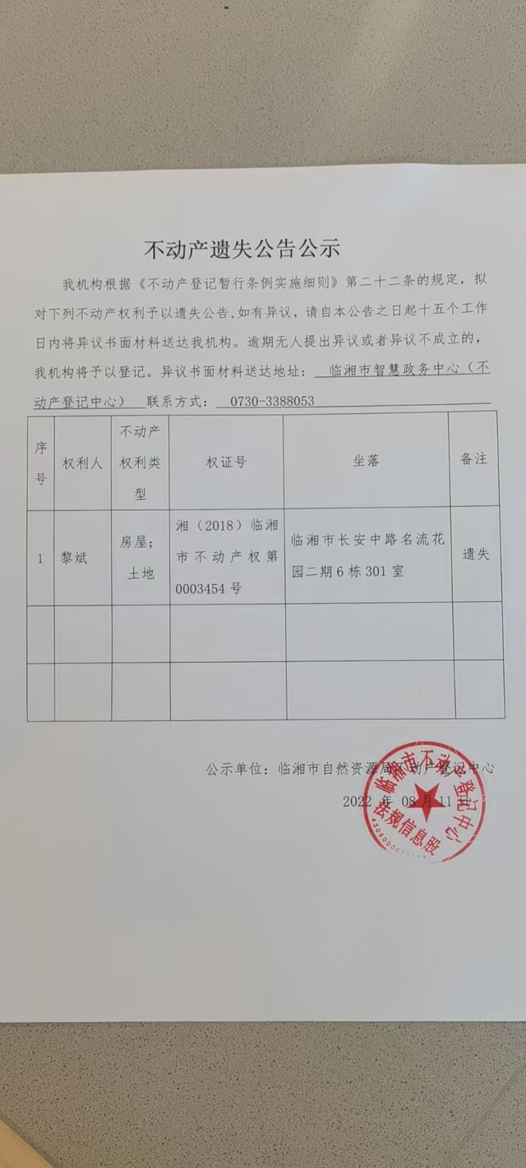 黎斌不动产遗失公告公示