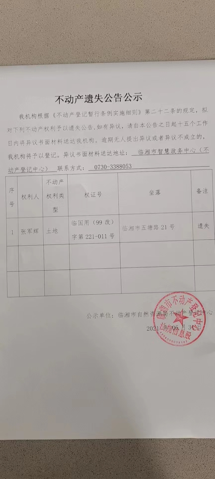 张军辉不动产遗失公告公示