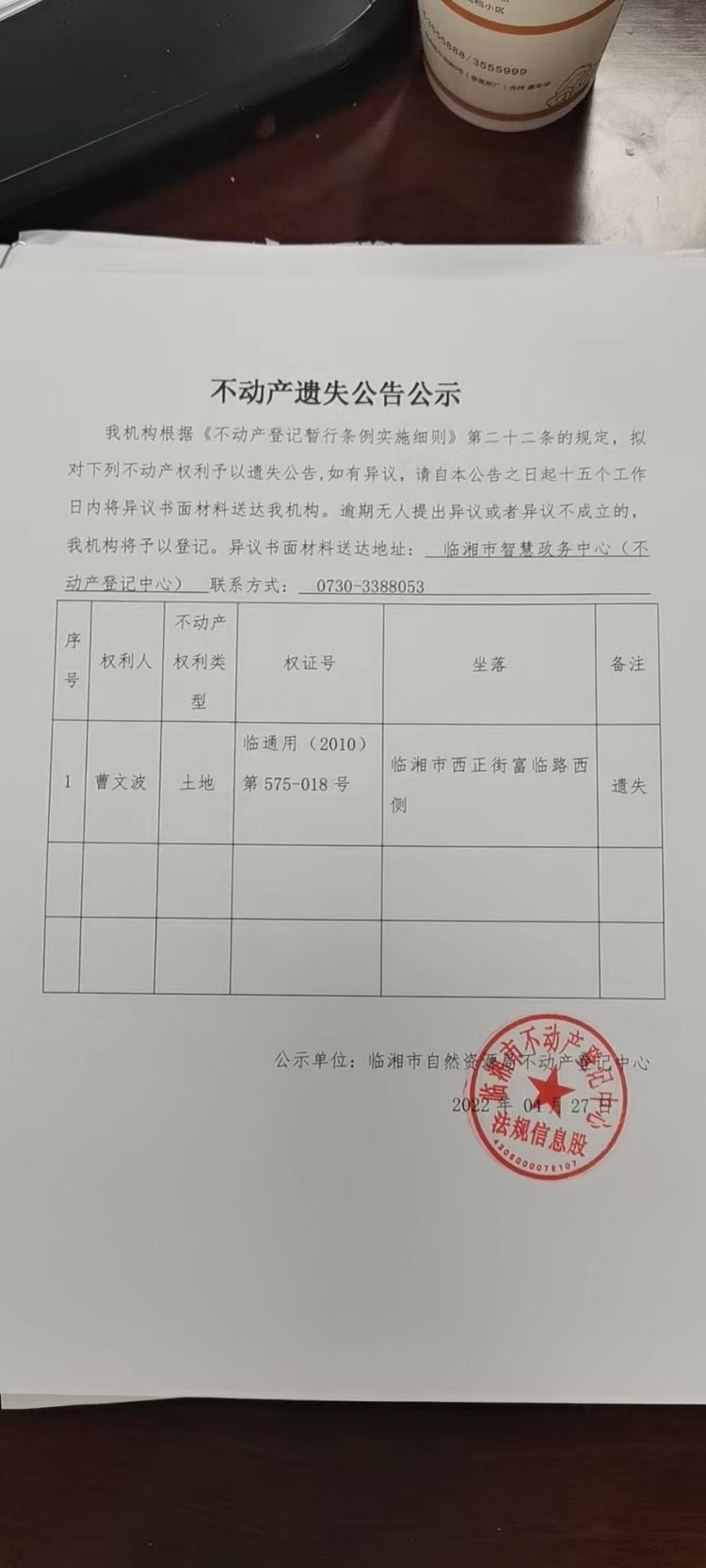 曹文波不动产遗失公告公示