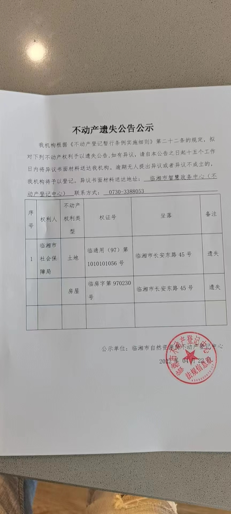 临湘市社会保障局不动产遗失公告公示