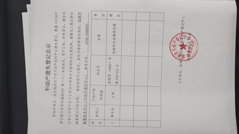 柳水生不动产遗失登记公示