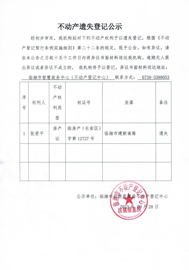 张爱平不动产遗失登记公示