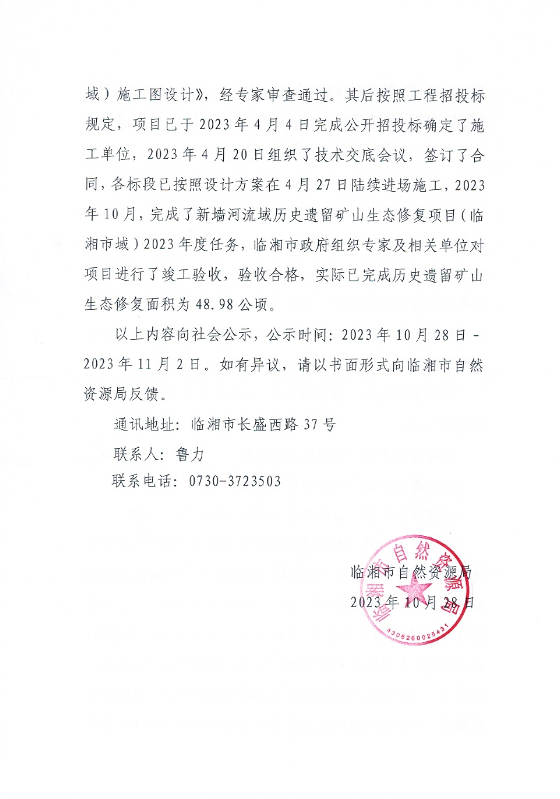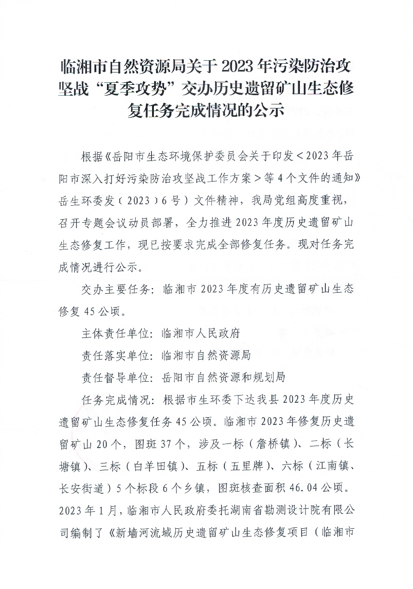 临湘市自然资源局关于2023年污染防治攻坚战“夏季攻势”交办历史遗留矿山生态修复任务完成情况的公示