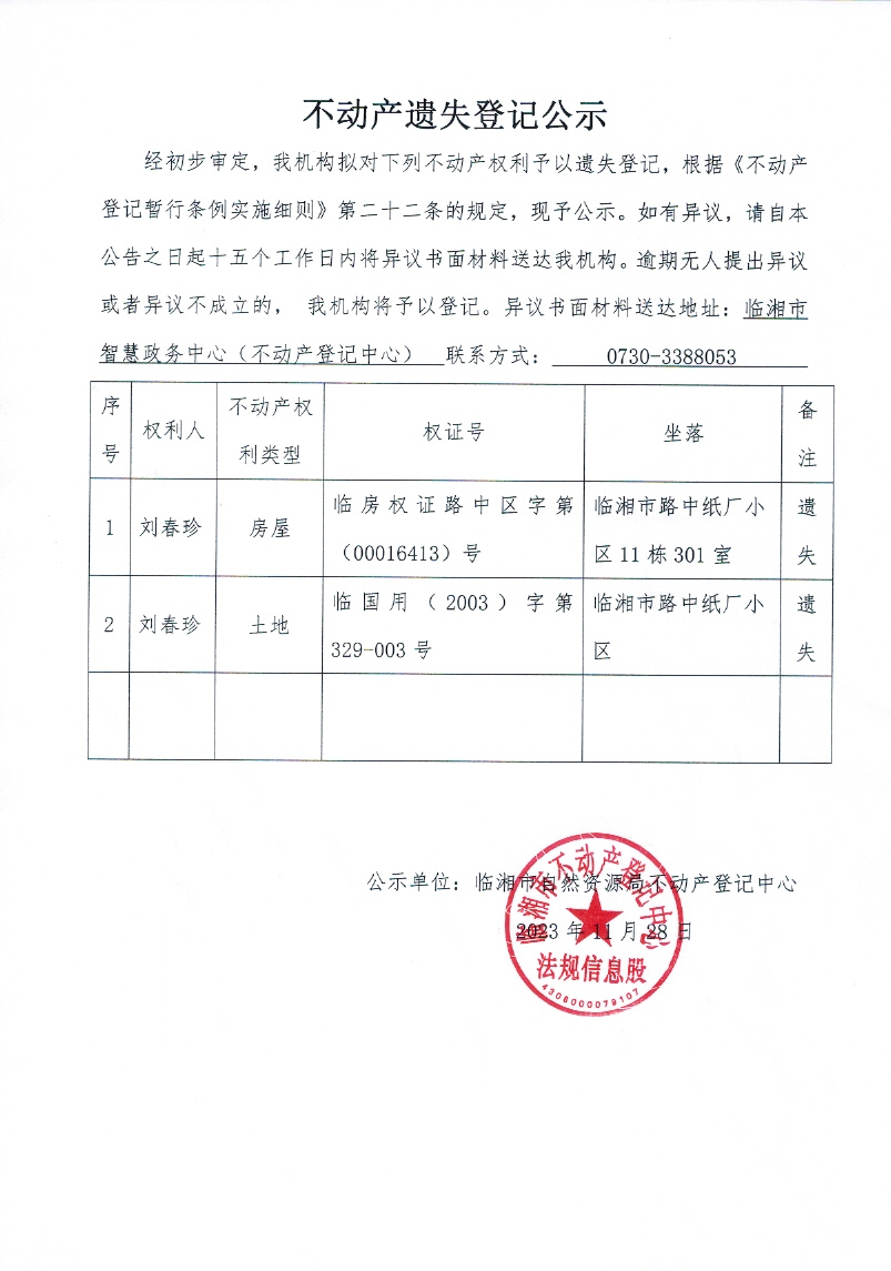 刘春珍不动产遗失登记公示