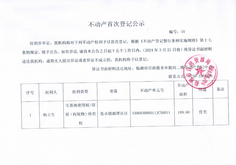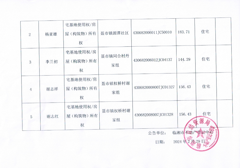 不动产首次登记公示(杨立生、杨亚雄、李兰初、谢志祥、谢志红)