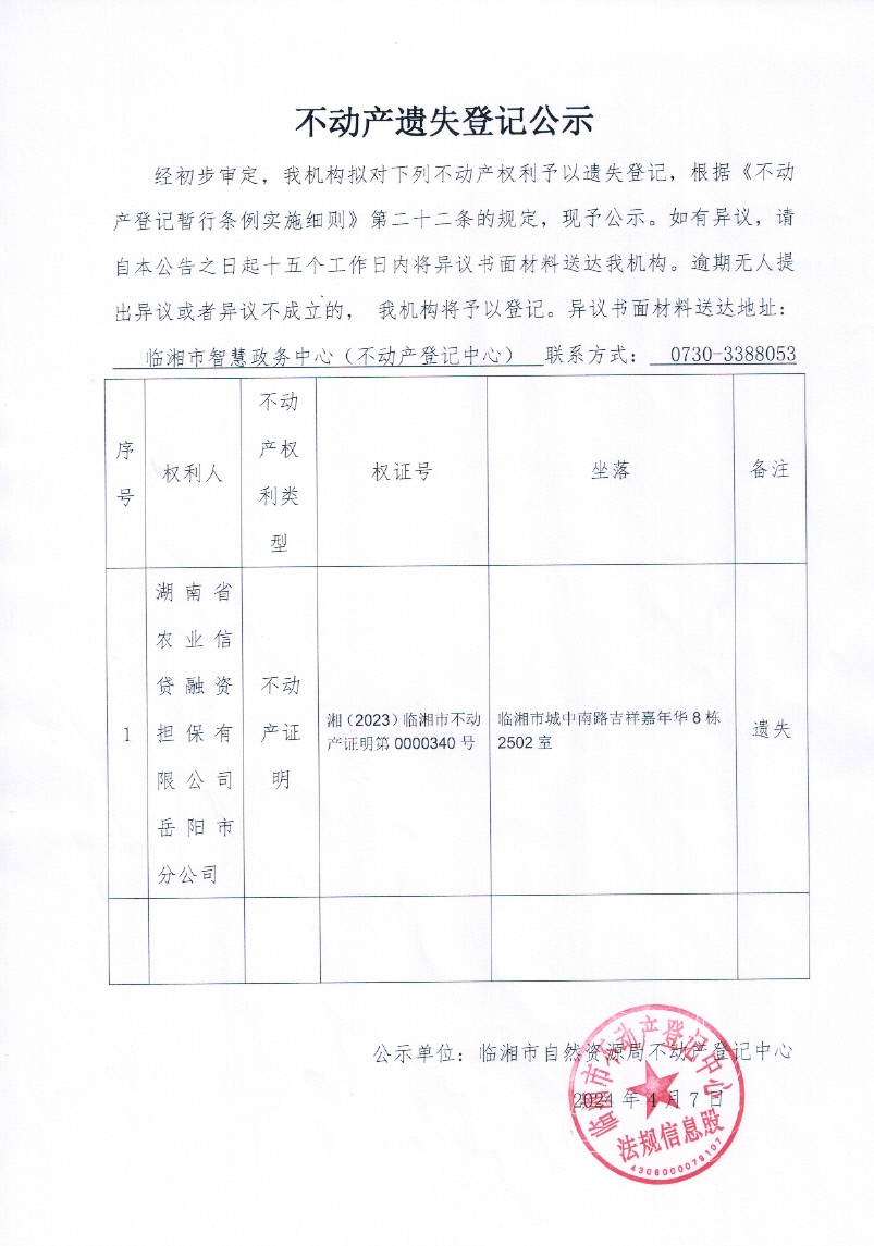 湖南省农业信贷融资担保有限公司岳阳市分公司不动产遗失登记公示