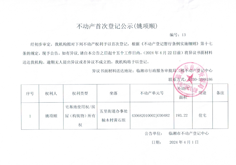 不动产首次登记公示姚项顺