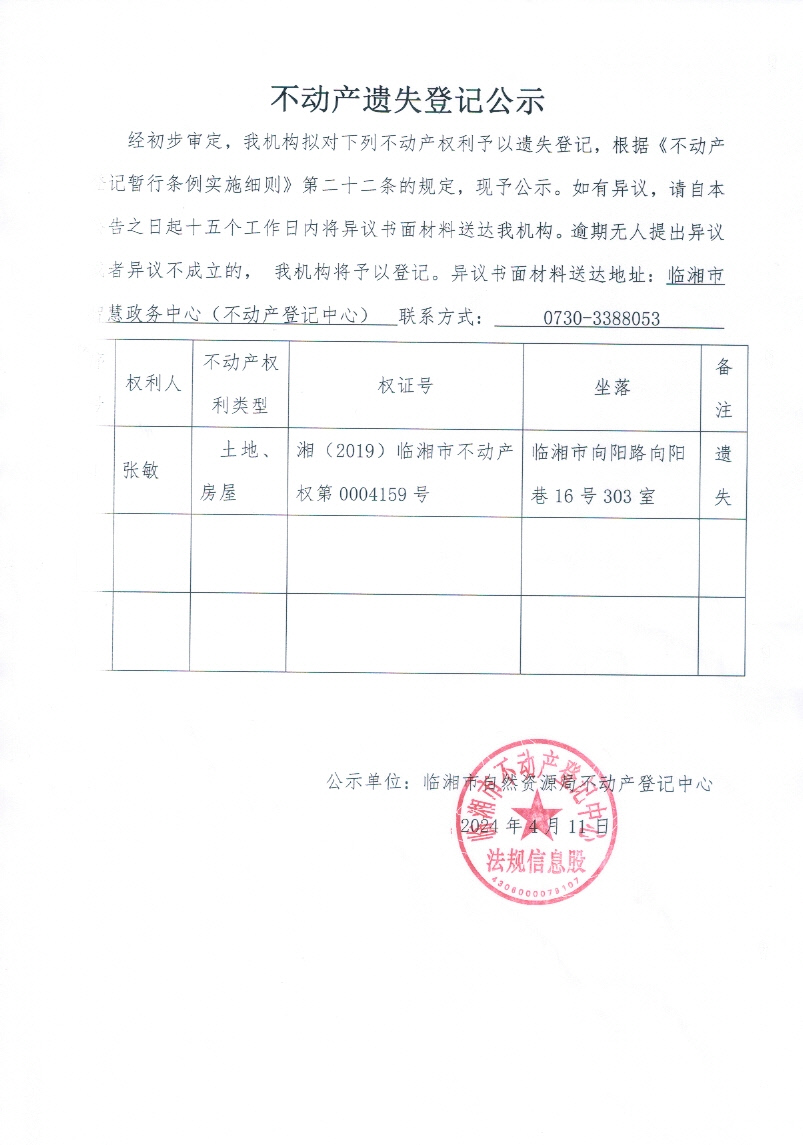 张敏不动产遗失登记公示