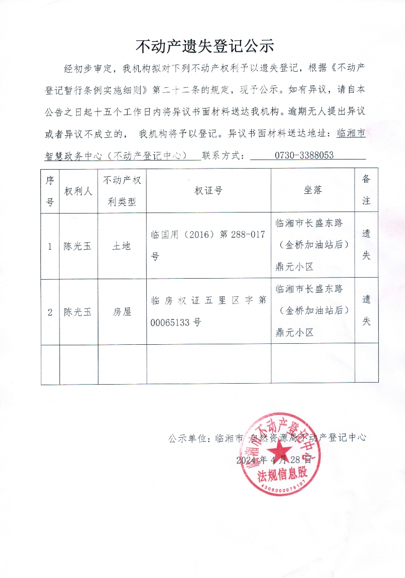 陈光玉不动产遗失登记公示