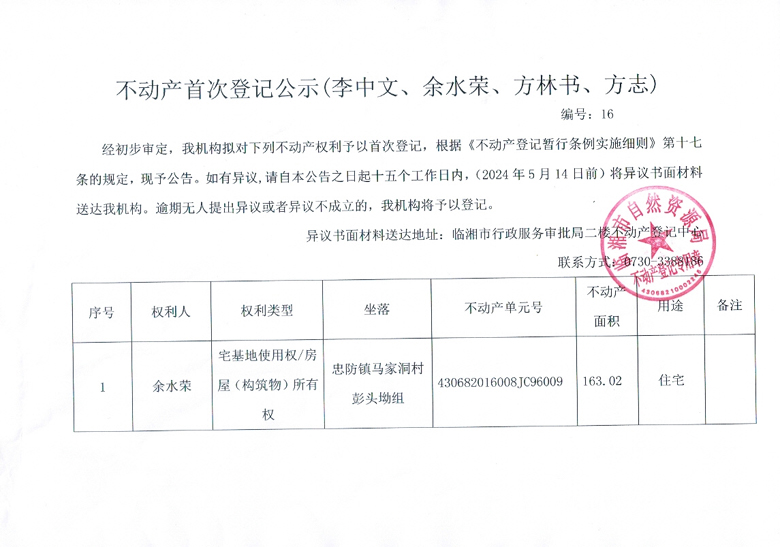 不动产首次登记公示(余水荣、李中义、方林书、方志)