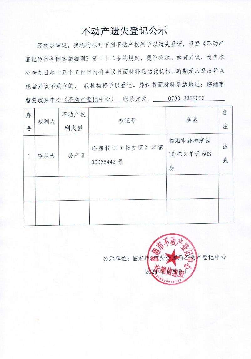 李从夭不动产遗失登记公示