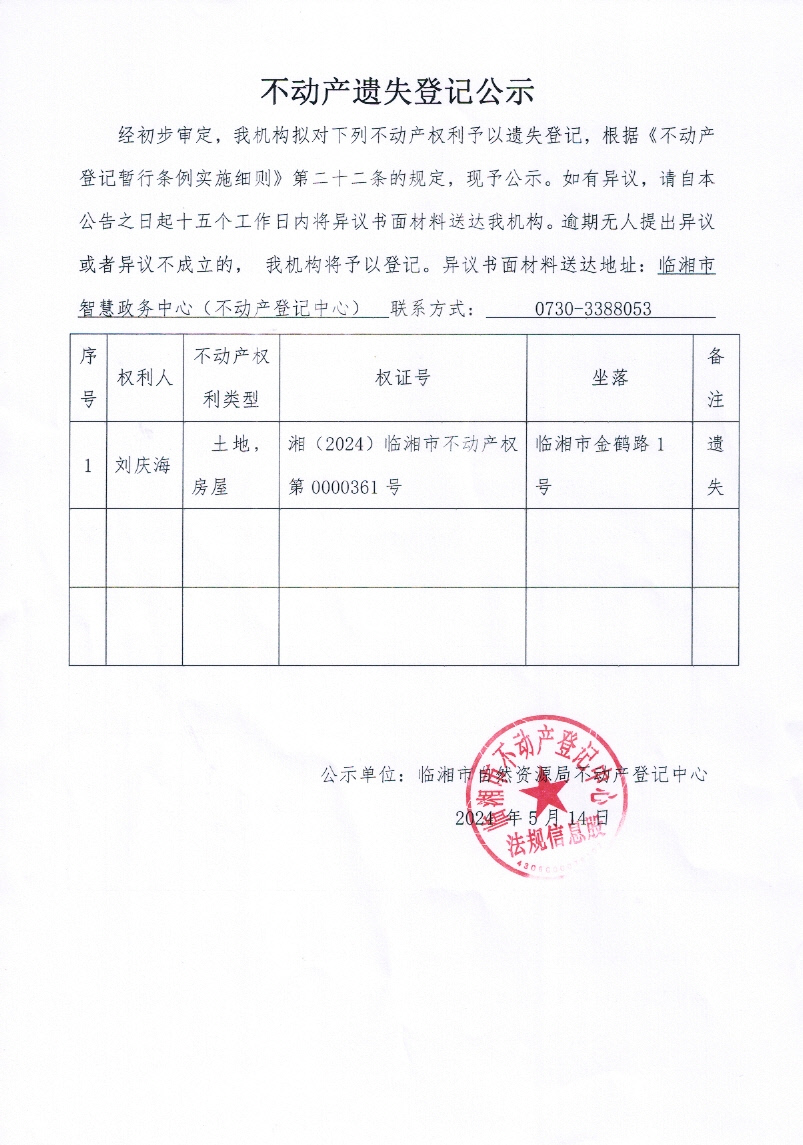 刘庆海不动产遗失登记公示