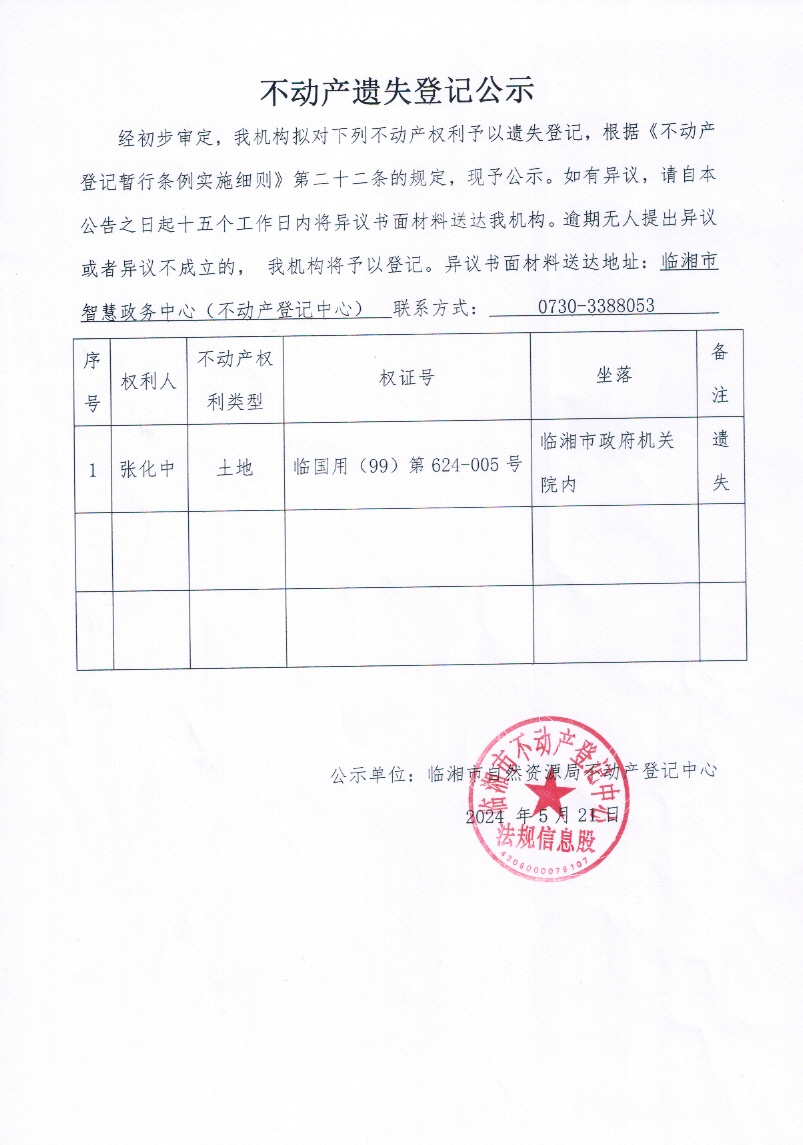 张化中不动产遗失登记公示