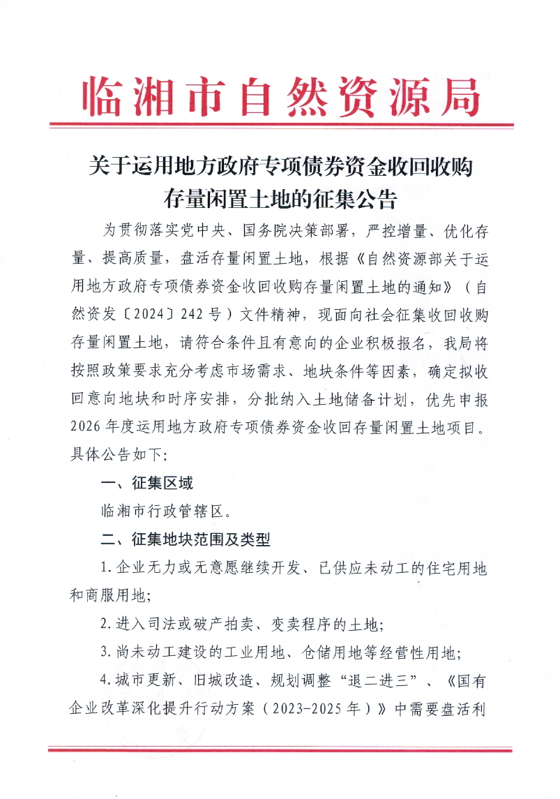 临湘市自然资源局关于运用地方政府专项债券资金收回收购存量闲置土地的征集公告
