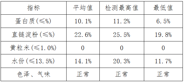 其他指标有黄粒米、色泽气味、水份、蛋白质、直链淀粉、如表3所示: