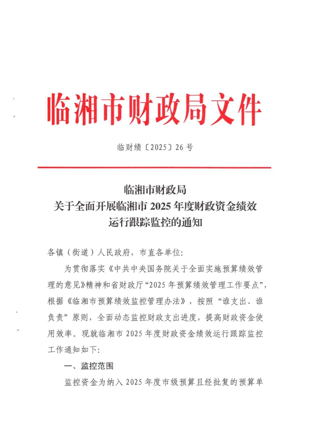 临湘市财政局关于全面开展临湘市2025年度财政资金绩效运行跟踪监控的通知