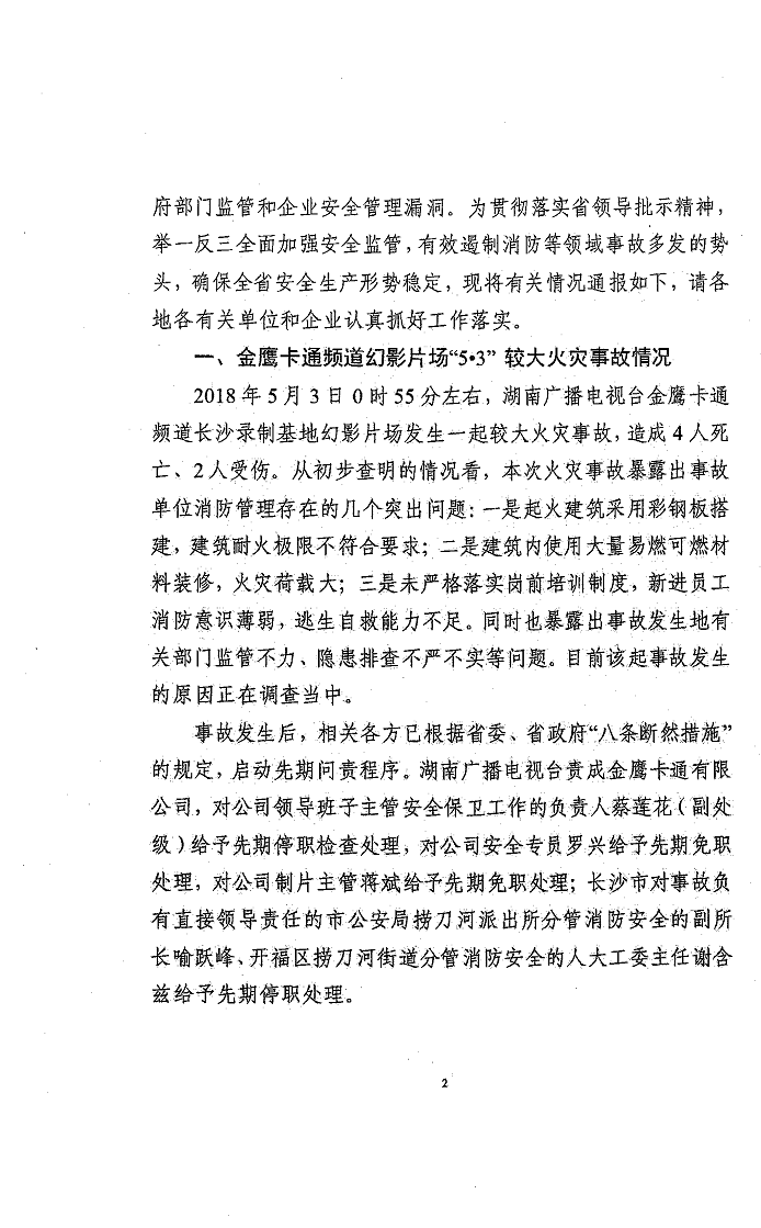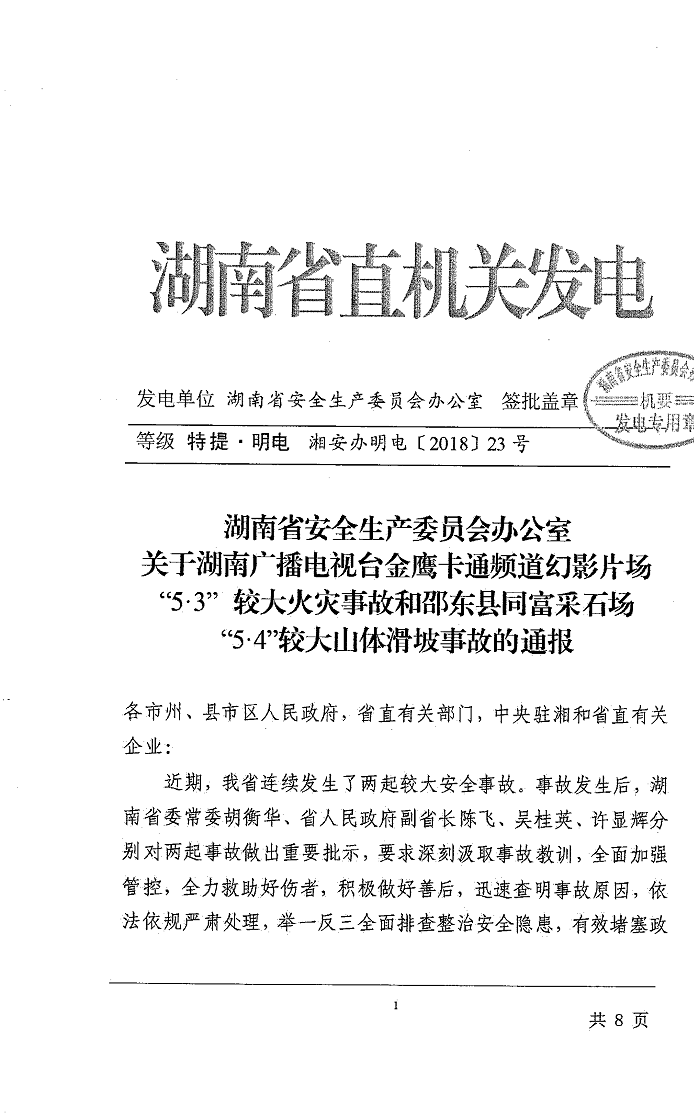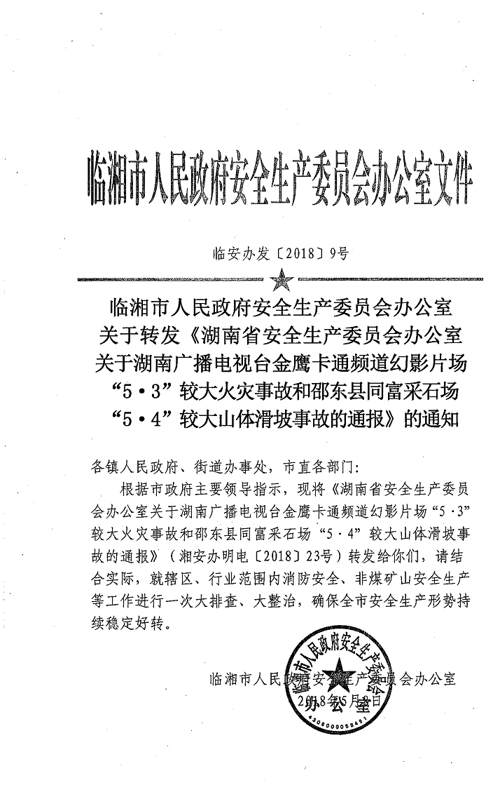 关于转发《湖南省安全生产委员会办公室关于湖南广播电视台金鹰卡通频道幻影片场“5·3”较大火灾事故和邵东县同富采石场“5·4”较大山体滑坡事故的通报》的通知