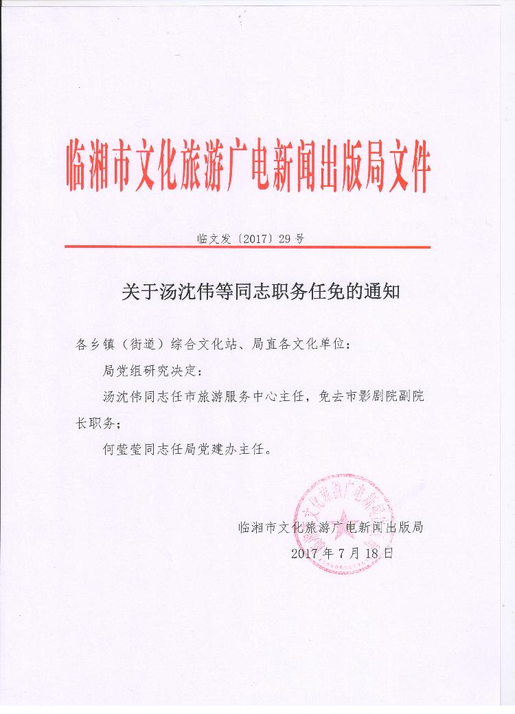 关于汤沈伟等同志职务任免的通知