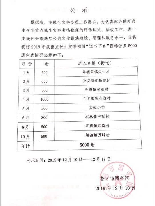 2019年送图书下乡情况公示