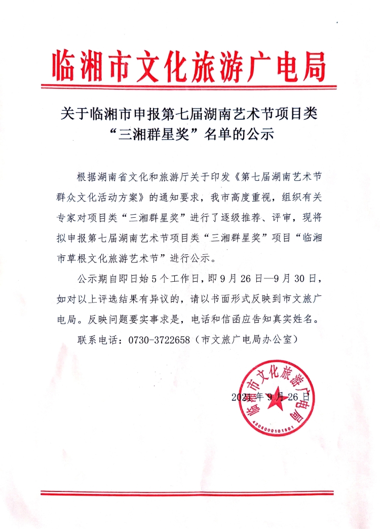 关于临湘市申报第七届湖南艺术节项目类“三湘群星奖”名单公示