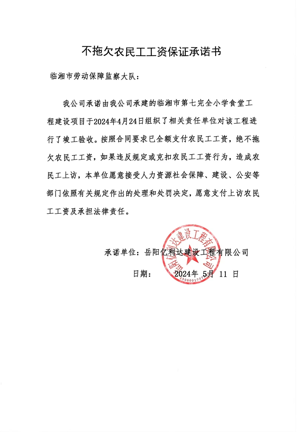 关于岳阳亿利达建设工程有限公司承建的临湘市第七完全小学食堂工程建设项目已完工,现向我局申请退还农民工保证金。根据湘人社规[2022]4号文件第十二条规定:工程完工,施工总承包单位作出该项目不存在未解决的拖欠农民工工资问题书面承诺,并在属地人力资源社会保障行政部门门户网公示30日后,可以持承诺书和工程完工资料向属地人力资源社会保障行政部门申请返还工资保障金,现将该公司承诺书公示如下: