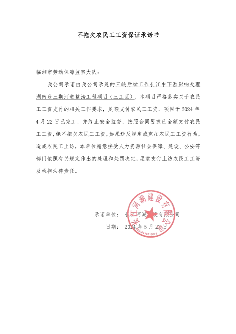 关于长江河湖建设有限公司承建的三峡后续工作长江中下游影响处理湖南段三期河道整治工程项目(三工区)项目不拖欠农民工工资承诺书的公示