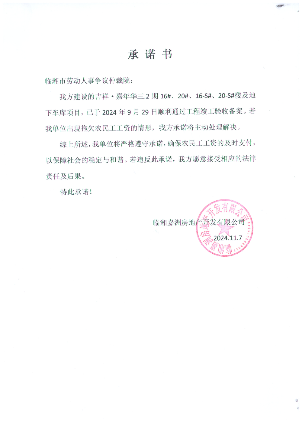 临湘嘉州房地产开发有限公司承建的吉祥.嘉年华三.2期16#、20#、16-S#、20-S#楼及地下车库项目现以完工,现向我局申请退还农民工保证金。根据湘人社规[2022]4号文件第十二条规定:工程完工,施工总承包单位作出该项目不存在未解决的拖欠农民工工资问题书面承诺,并在属地人力资源社会保障行政部门门户网公示30日后,可以持承诺书和工程完工资料向属地人力资源社会保障行政部门申请返还工资保障金,现将该公司承诺书公示如下: