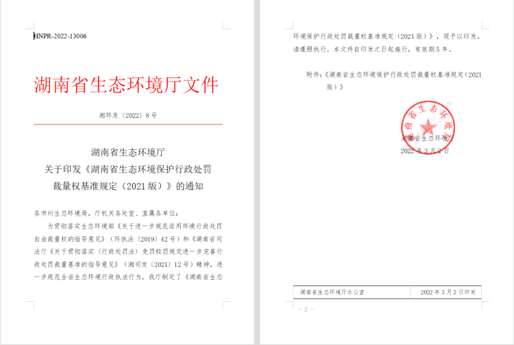 关于印发《湖南省生态环境保护行政处罚裁量权基准规定(2021版)》的通知