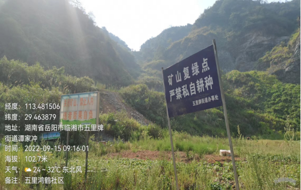 临湘市五里乡鸿鹤岭林场采石场复绿,并设立了警示牌