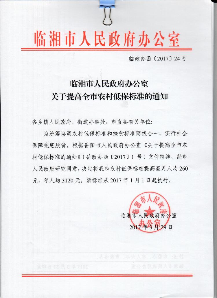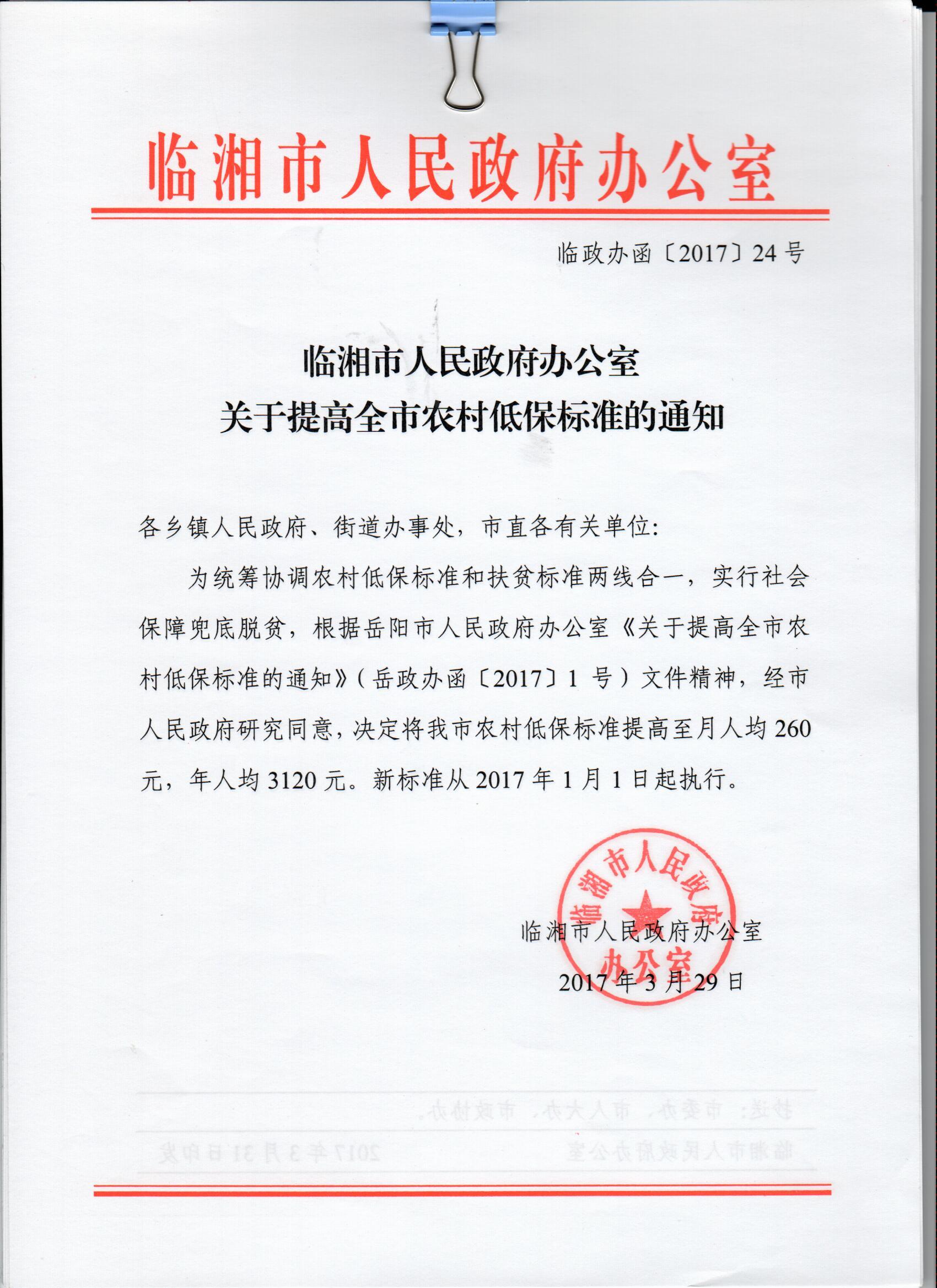临湘市人民政府办公室关于提高全市农村低保标准的通知