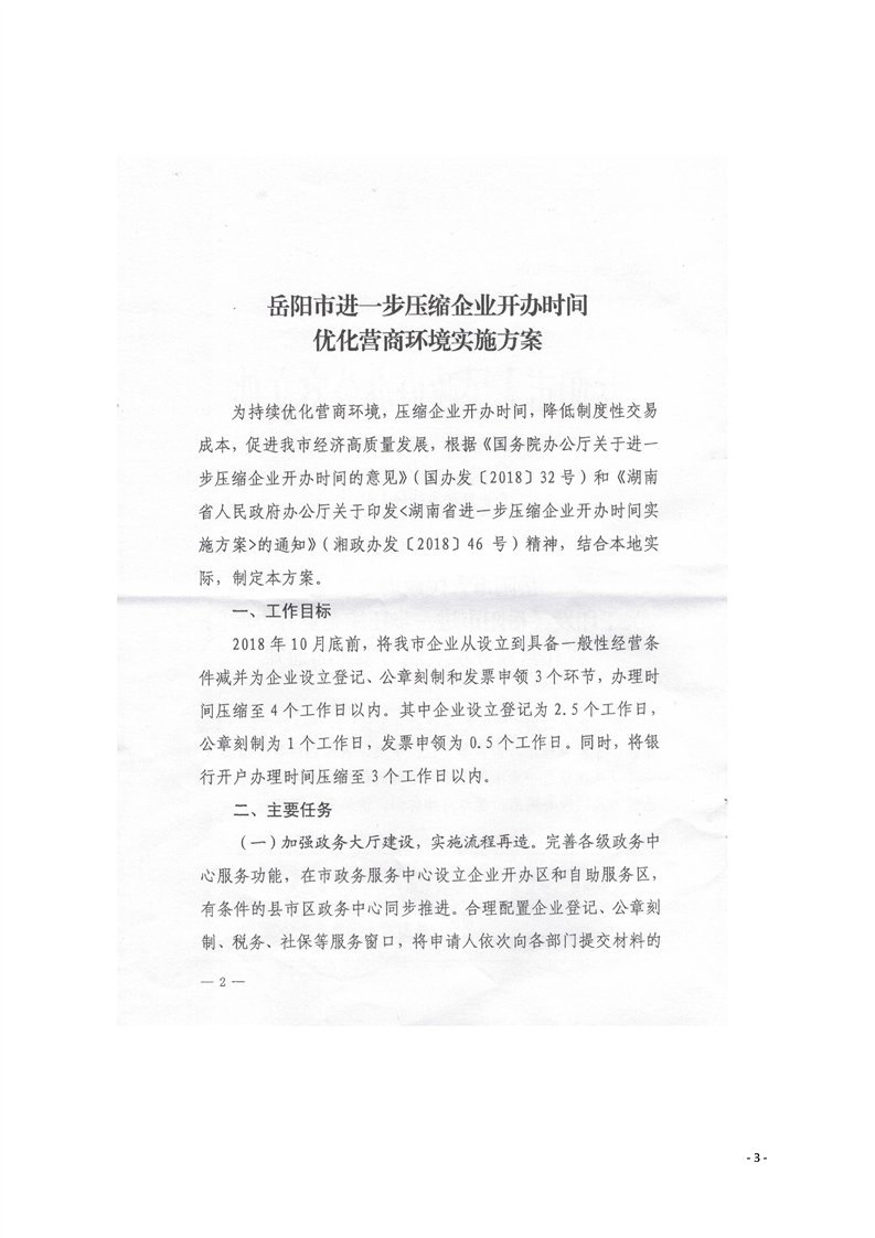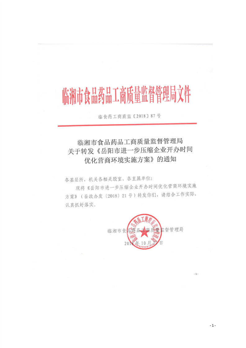 临湘市食品药品工商质量监督管理局关于转发《岳阳市进一步压缩企业开办时间优化营商环境实施方案》的通知