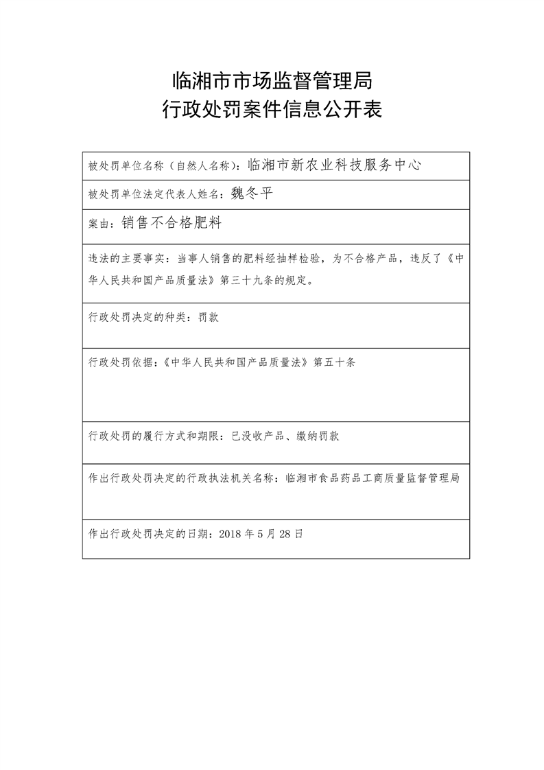临湘市新农业科技服务中心行政处罚案件信息公开表