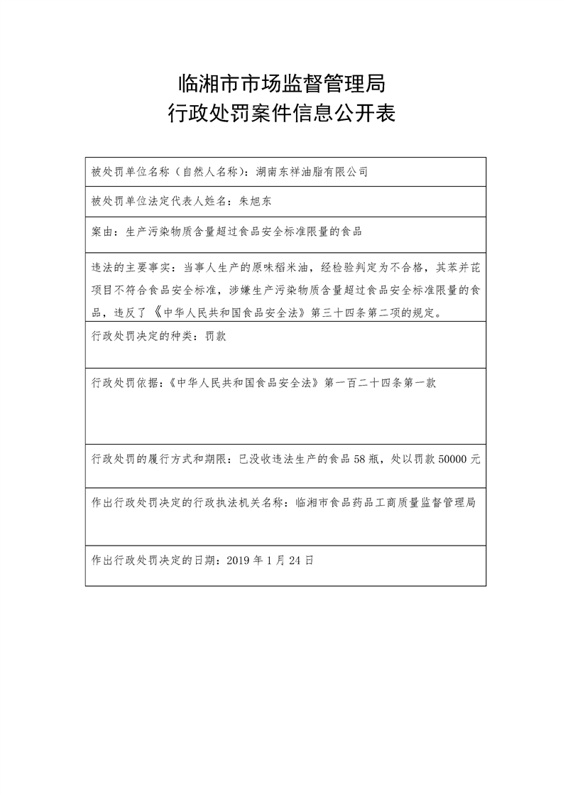 湖南东祥油脂有限公司行政处罚案件信息公开表