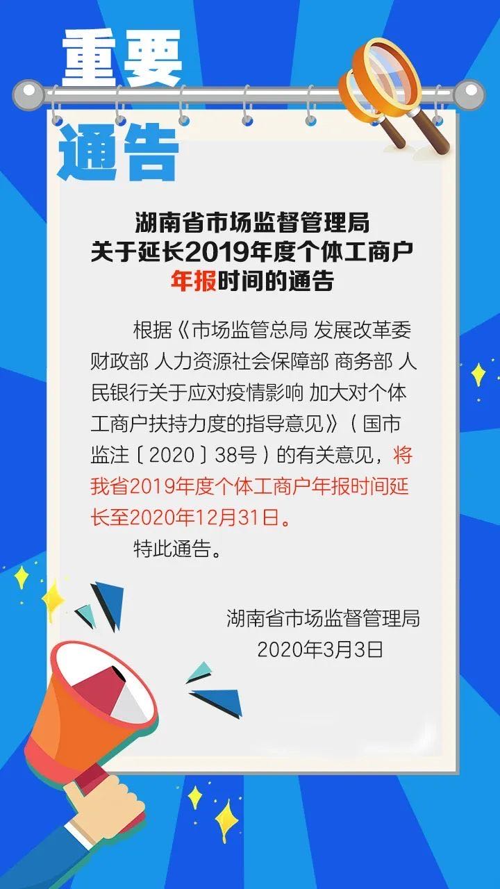 湖南省市场监督管理局关于延长2019年度个体工商户年报时间的通告