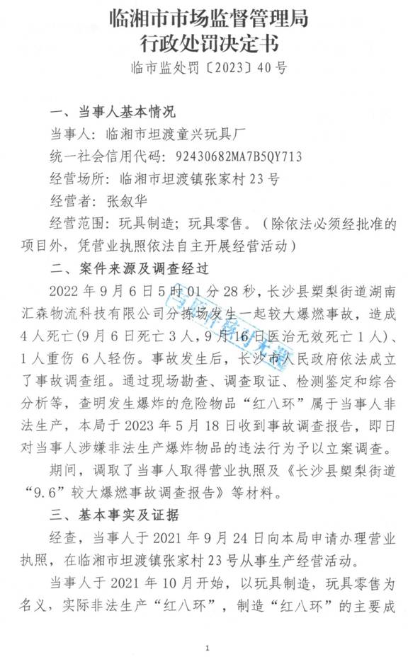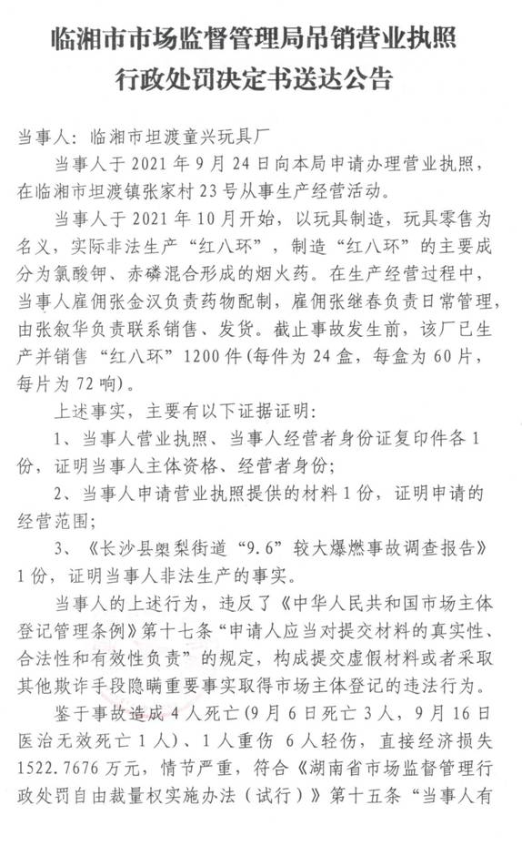 临湘市坦渡玩具厂行政处罚决定送达公告