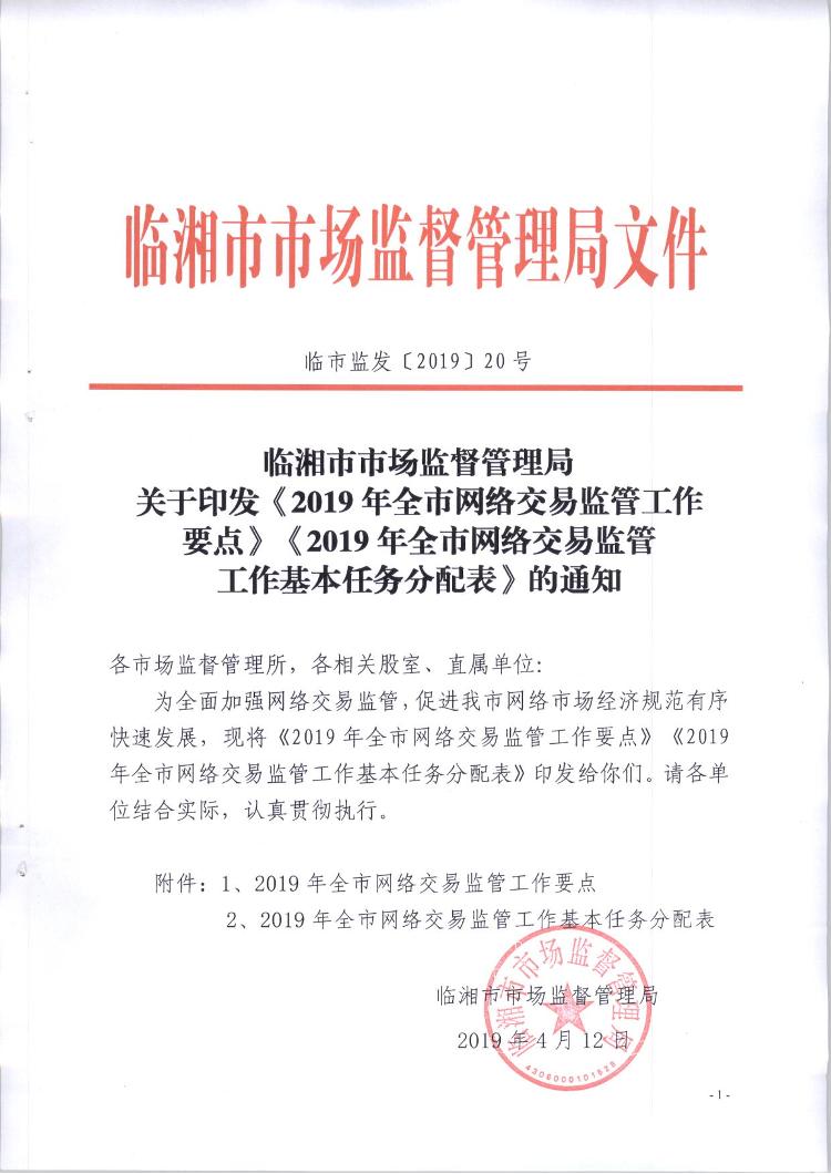 临湘市市场监督管理局关于印发《2019年全市网络交易监管工作要点》《2019年全市网络交易监管工作基本任务分配表》的通知