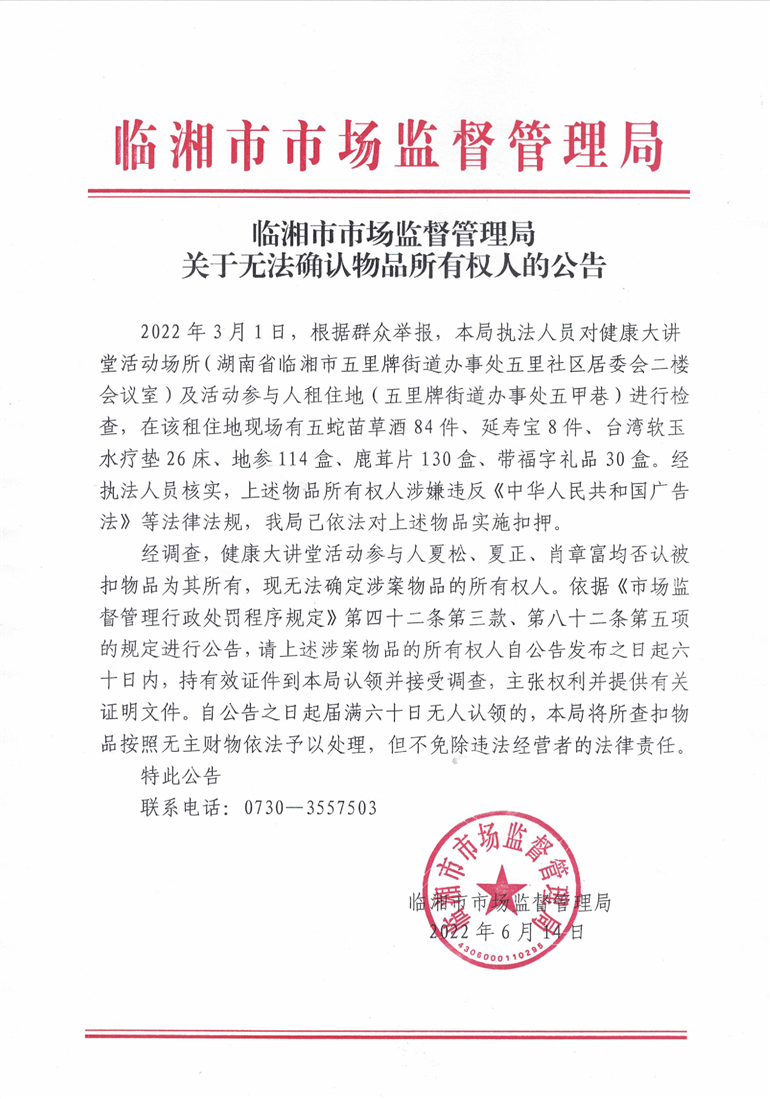 临湘市市场监督管理局关于无法确认物品所有权人的公告