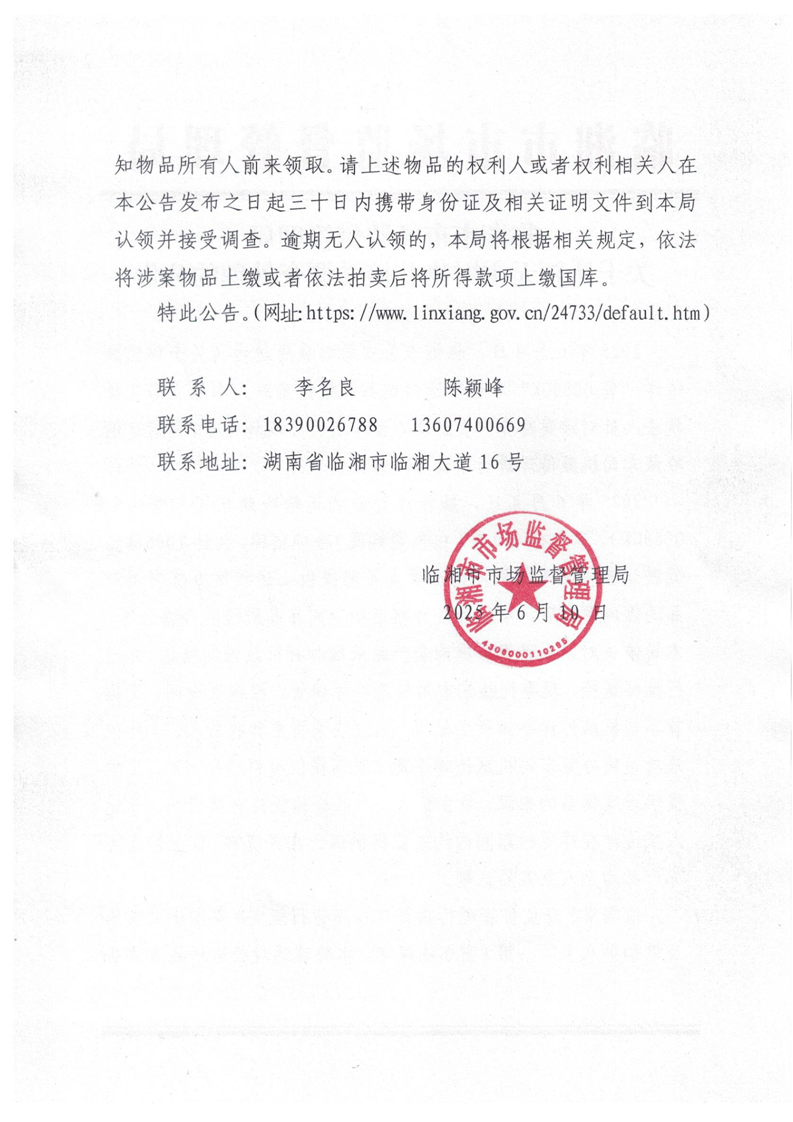 临湘市市场监督管理局关于认领无主财物并接受调查处理的公告1