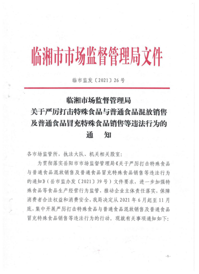 临湘市场监督管理局关于严厉打击特殊食品与普通食品混放销售及普通食品冒充特殊食品销售等违法行为的通知