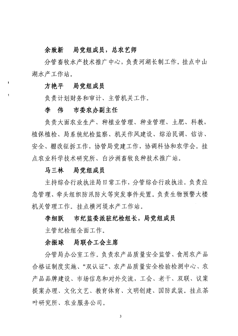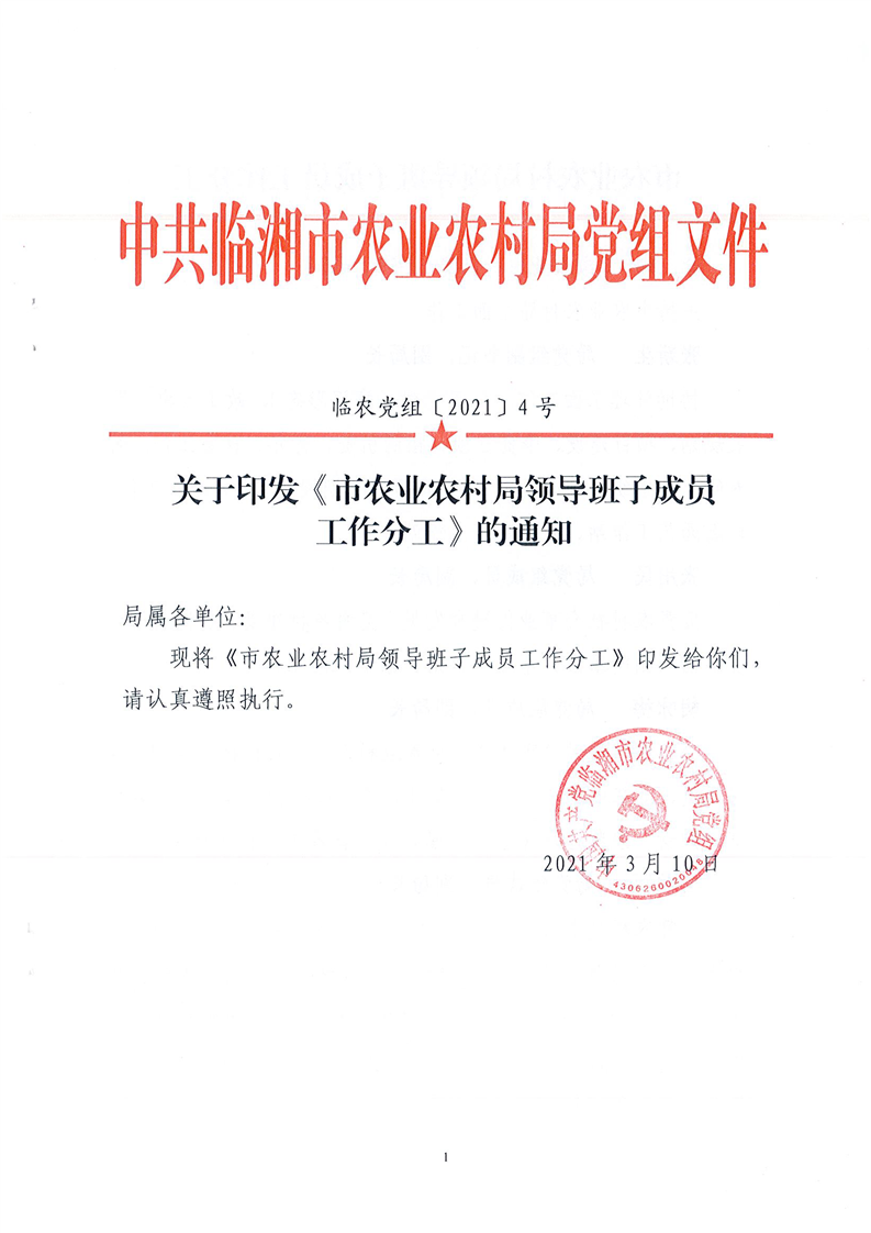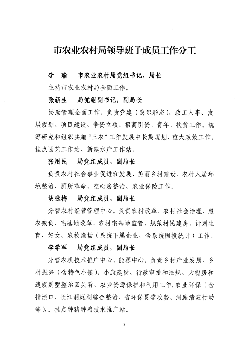 关于印发《市农业农村局领导班子成员 工作分工》的通知