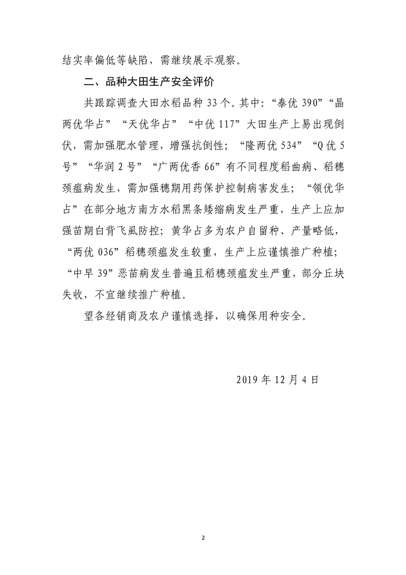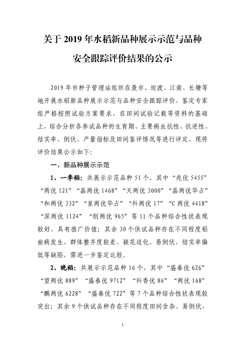 关于2019年水稻新品种展示示范与品种安全跟踪评价结果的公示