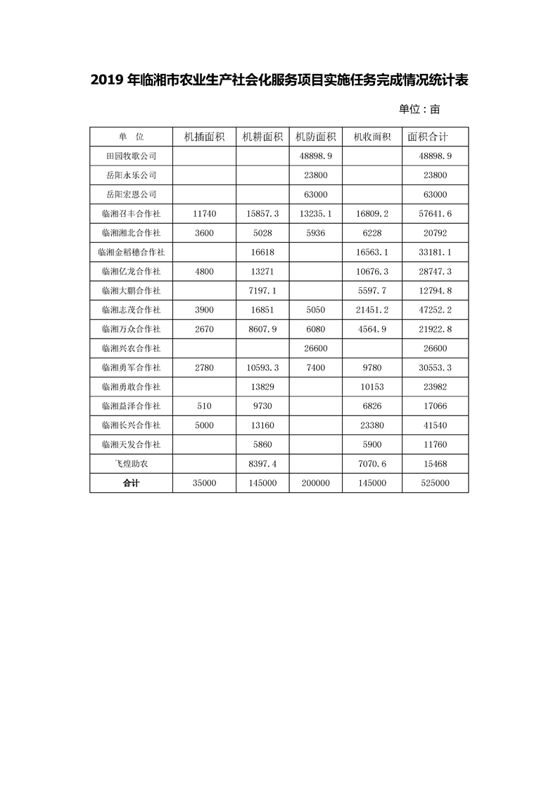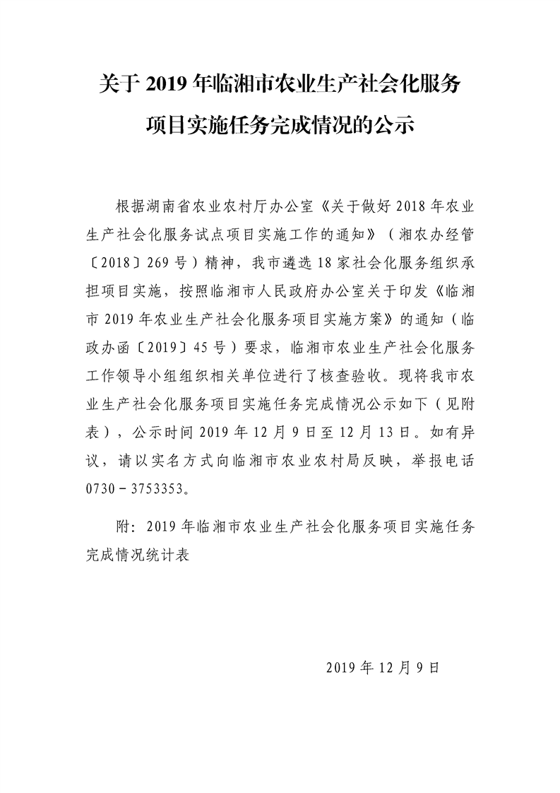 关于2019年临湘市农业生产社会化服务项目实施任务完成情况的公示