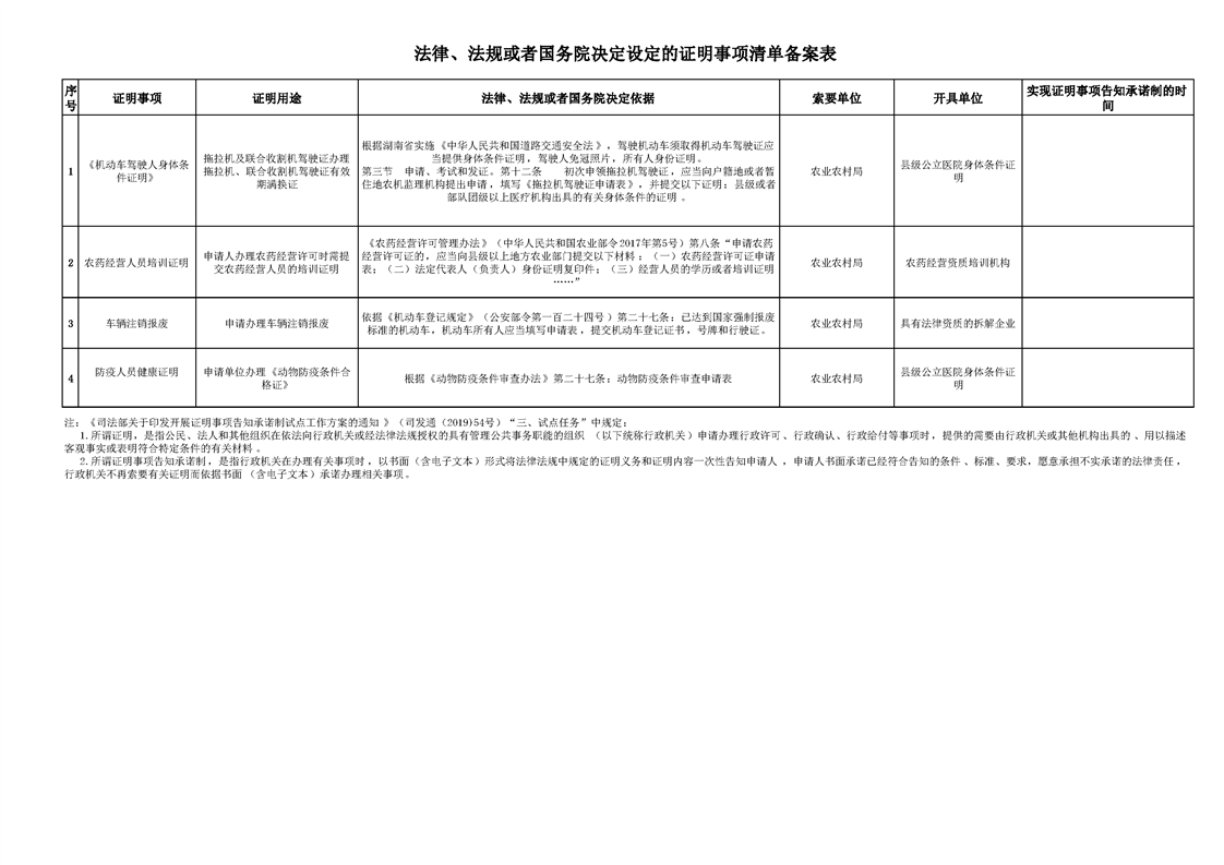 法律、法规或者国务院决定设定的证明事项清单备案表