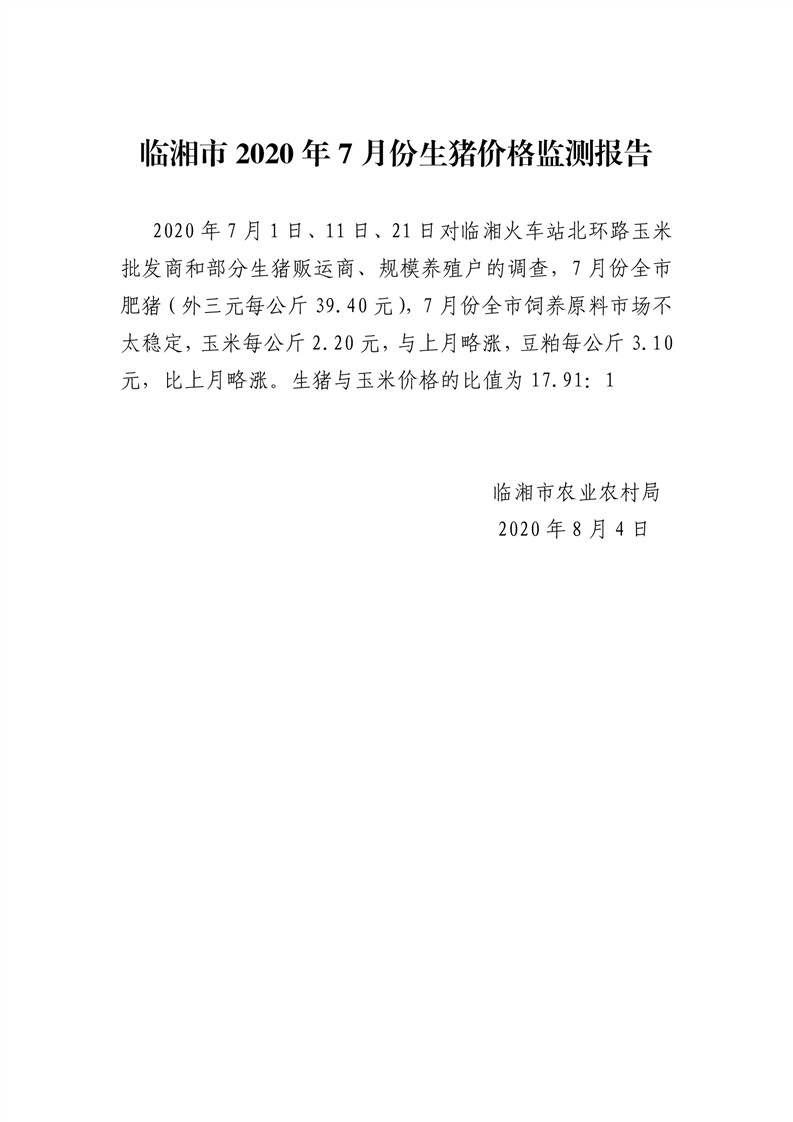 临湘市2020年7月份生猪价格监测报告