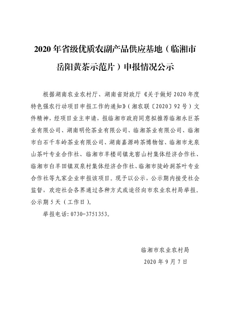 2020年省级优质农副产品供应基地(临湘市岳阳黄茶示范片)申报情况公示