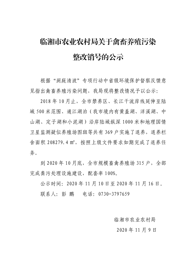 临湘市农业农村局关于禽畜养殖污染整改销号的公示