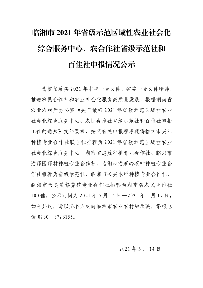 临湘市 2021 年省级示范区域性农业社会化 综合服务中心、农合作社省级示范社和 百佳社申报情况公示